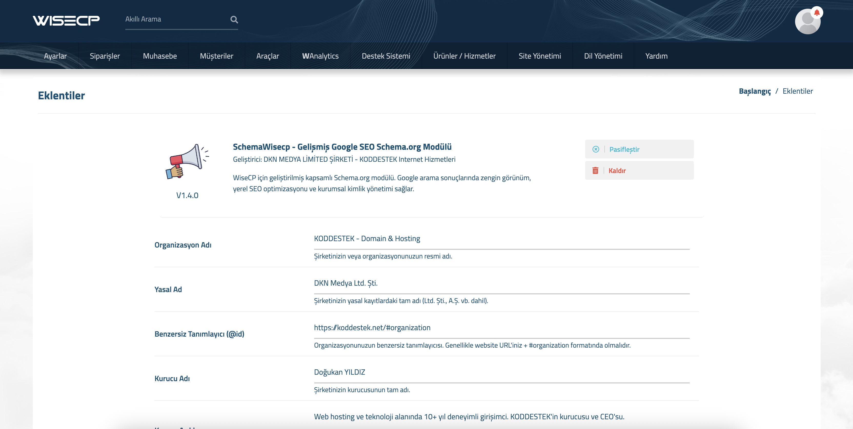 Yönetim panelinden Araçlar > Eklentiler >SchemaWisecp - Gelişmiş Google SEO Schema.org Modülü Ayarlar Firma Ve Site Bilgilerini Girin